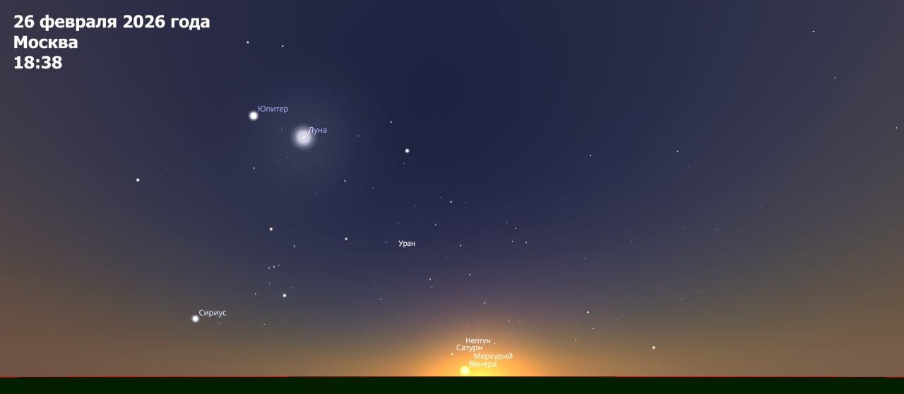 Единственным ярким объектом, доступным в течение всей ночи, остается Юпитер. Эта планета хорошо видна в регионе уже несколько месяцев, и дата 28 февраля не вносит изменений в условия ее обзора. Астрономы подчеркивают, что небесные тела движутся медленно, поэтому текущая конфигурация сохраняется в течение многих дней. Увидеть тот же состав планет можно было и неделю назад, и это будет возможно в начале марта.