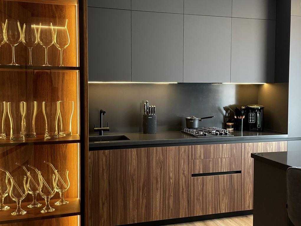 Для семьи с детьми мы проектируем безопасное пространство: закругленные углы, доводчики, блокировки ящиков, износостойкие фасады. Если речь идет о пожилых людях — минимизируем верхние шкафы, делаем больше выдвижных систем. Духовой шкаф размещаем на уровне груди, чтобы не приходилось наклоняться. Для одного человека кухня может быть компактной, с акцентом на рабочую поверхность, а не на хранение. Иногда достаточно варочной панели на две конфорки.