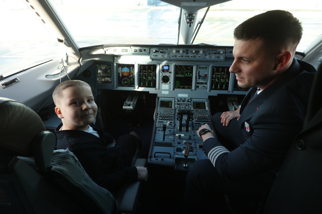 Самым важным событием для Егора стало посещение кабины самолета. Экипаж авиакомпании «Россия» вместе с ним провел предполетный осмотр самолета SSJ-100. Командир воздушного судна Олег Кобылянский и второй пилот Дарья Рябова рассказали об органах управления самолетом, продемонстрировали работу гидравлической системы и системы кондиционирования, а затем ответили на вопросы Егора. «Будем рады видеть Егора в нашей команде, когда он подрастет», – сказал Кобылянский.
