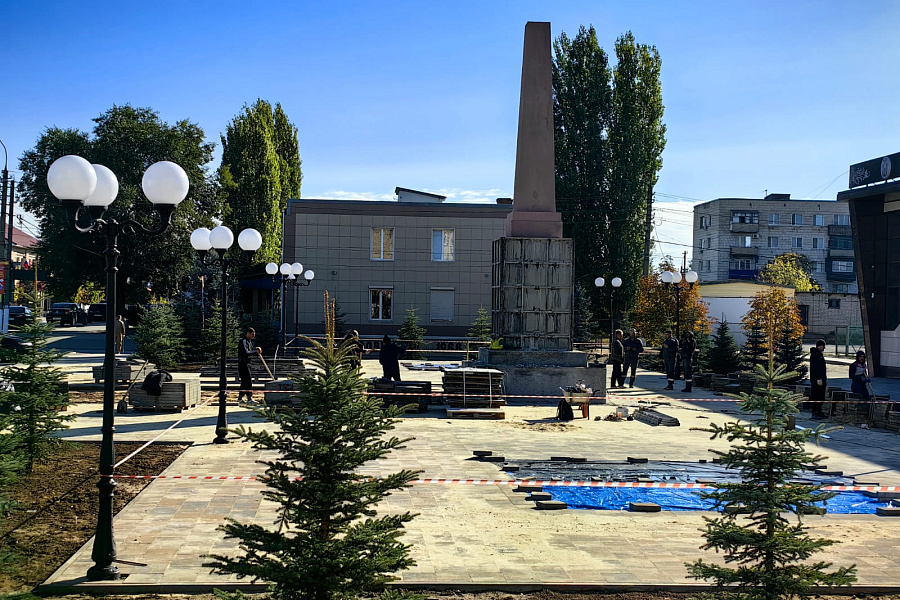 В Суровикино подрядчик уже построил и залил основание мемориала, сейчас идет поэтапная заливка самой стелы. В сквере неподалёку уложили фундамент под будущий фонтан, провели прокладку электрокабелей, бордюры полностью установили, завершают мощение тротуаров и занимаются озеленением.